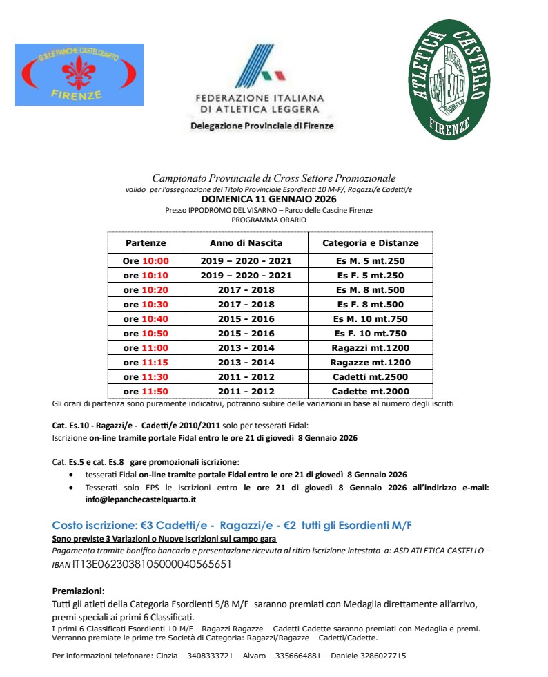 Il GS Le Panche Castelquarto insieme all'Atletica Castello organizza, Domenica 11 Gennaio 2026 presso l'Ippodromo del Visarno alle Cascine,  i Campionati FIDAL di Cross Provinciali per le categorie Cadetti/e, Ragazzi/e, Esordienti 10 M/F.