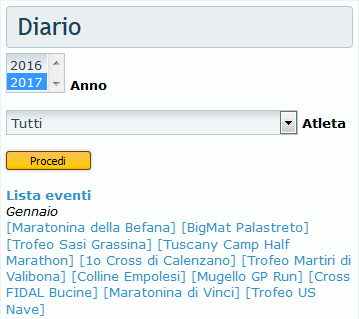 I contenuti sono selezionabili per anno e per atleta. La selezione per atleta è sperimentale, e ricerca i nostri nomi i tutte le classifiche in formato Excel presenti nella sezione "Classifiche". A causa di omonimie o nomi trascritti male nelle classifiche, non tutto funzionerà alla perfezione...